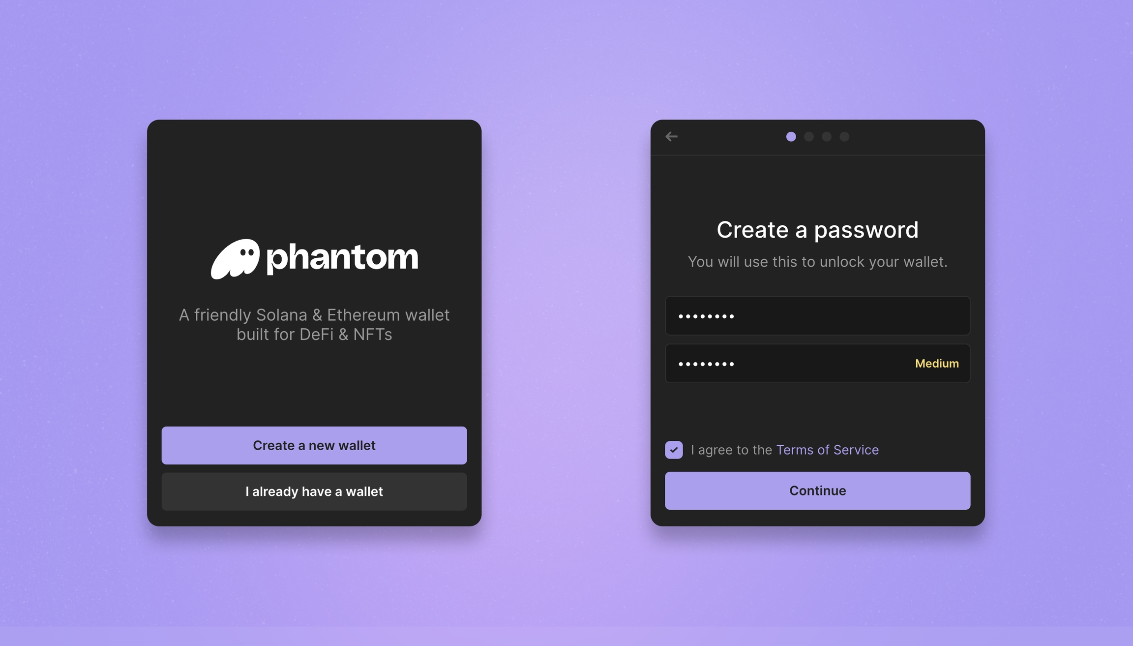 Visit https://phantom.app/downloadarrow-up-right and select your browser type. Follow the steps in the respective extension store to add Phantom to your browser. After installation, you will see Phantom in your browser plugins. If you are a new user, select "Create New Wallet" and create a password. If you already have a Solana wallet, simply click "I already have a wallet" and enter the seed phrase to restore the wallet.