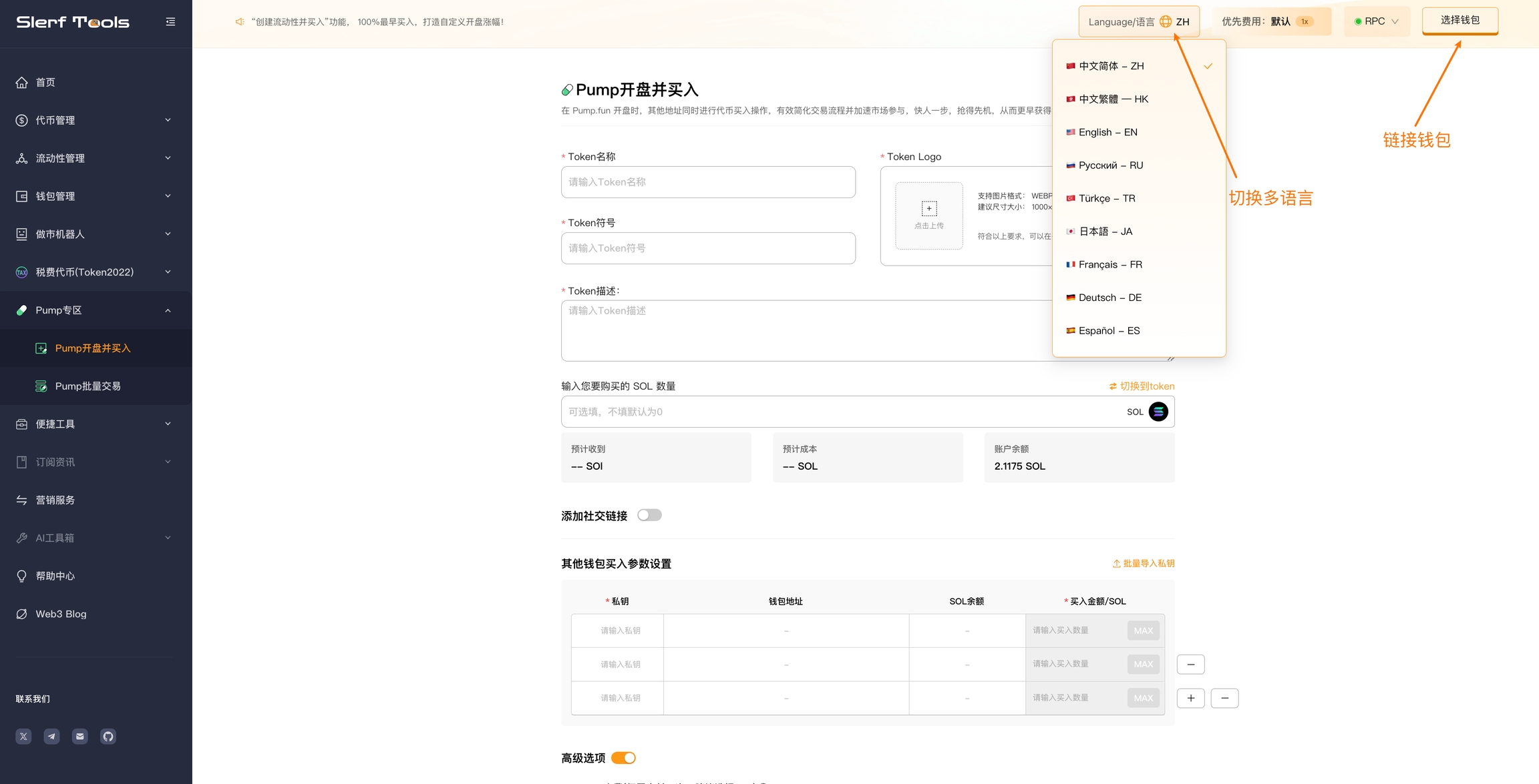 Запуск и покупка Pump:https://slerf.tools/zh-cn/pump-launch-and-buy-token/solana