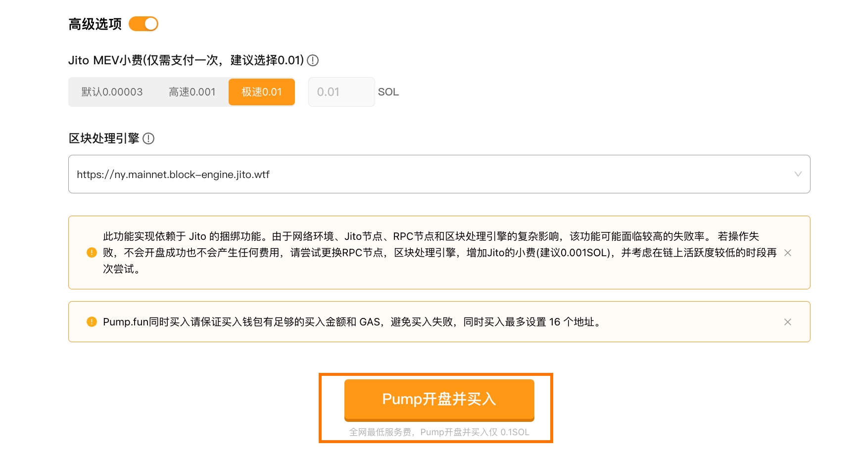 Эта функция реализована с помощью Jito. Из-за сетевых условий, узлов Jito, узлов RPC и сложности движка обработки блоков, эта функция может иметь высокий процент отказов. Если операция не удалась, открытие не будет успешным и не будет взиматься плата. Пожалуйста, попробуйте изменить узел RPC, движок обработки блоков, увеличить чаевые Jito (рекомендуется 0.01 SOL) и попробовать снова в менее активное время сети.