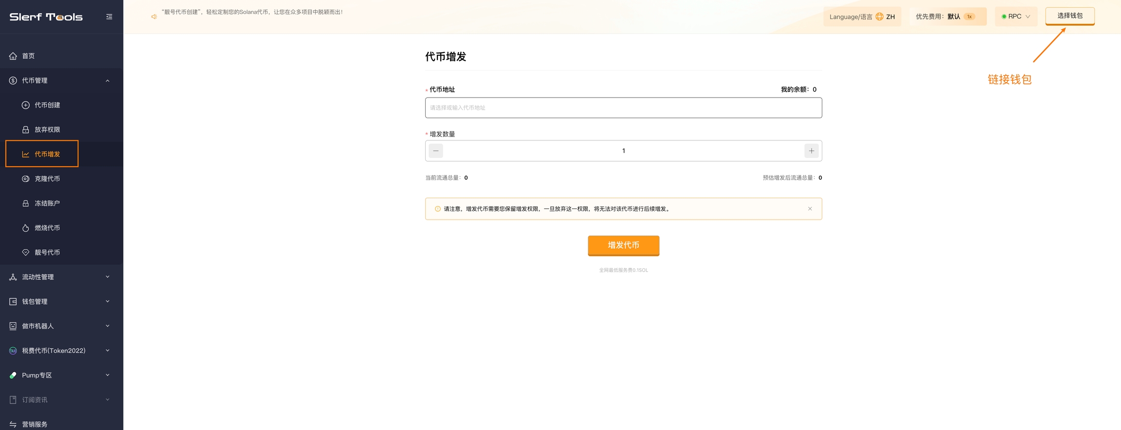 Перейдите на страницу дополнительной эмиссии токенов в SlerfTools. В правом верхнем углу доступна функция смены языка.