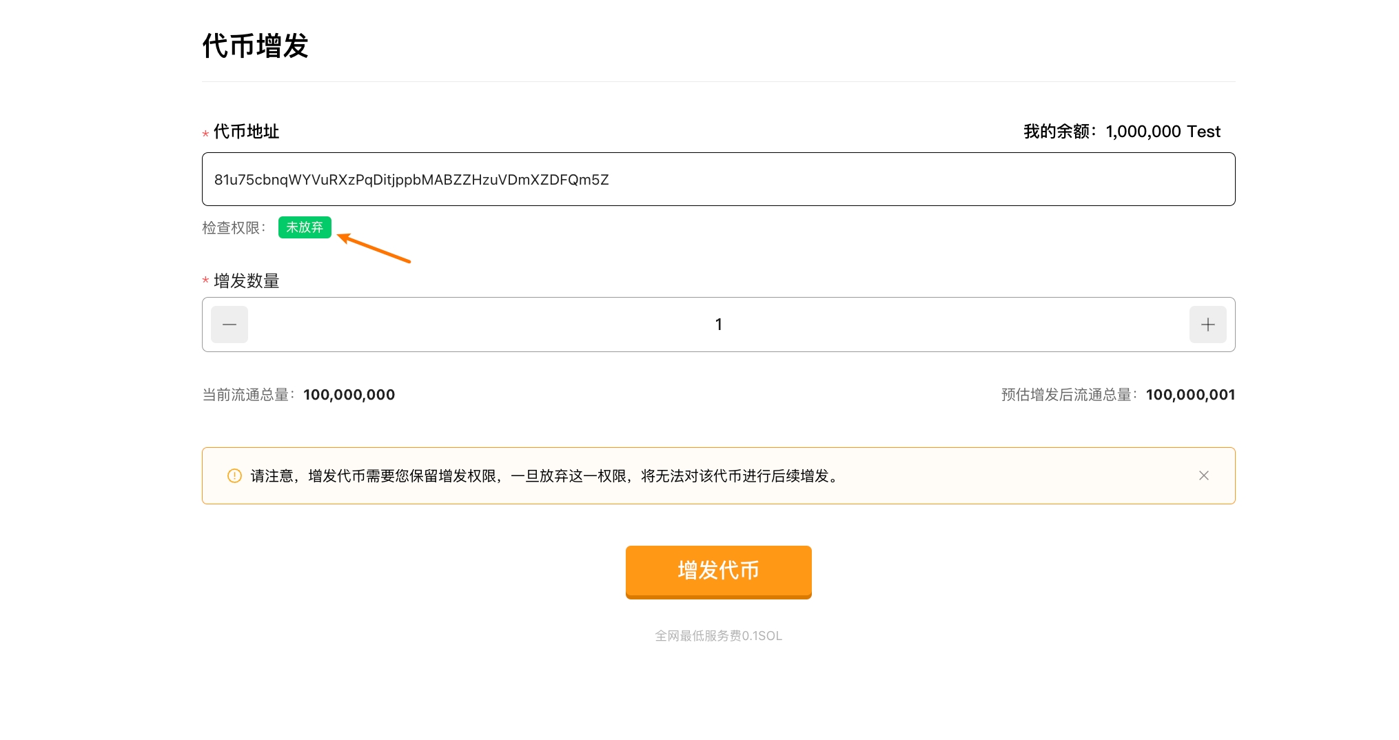 Проверьте права на дополнительную эмиссию токенов: • Если права на дополнительную эмиссию токенов уже были отменены или текущий подключенный кошелек не имеет таких прав, будет отображено сообщение “Отказано”, и эмиссия невозможна. • Если текущий подключенный кошелек имеет права на дополнительную эмиссию токенов, и права не были отменены, вы сможете выполнить эмиссию, как показано на изображении ниже.