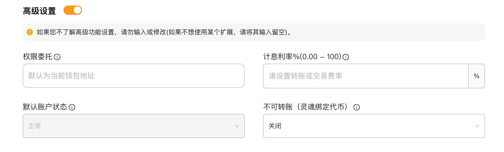Процентная ставка %(0.00 - 100): установите процентную ставку для вашего токена, имитируя реальные активы, такие как облигации, и получайте проценты в любое время.