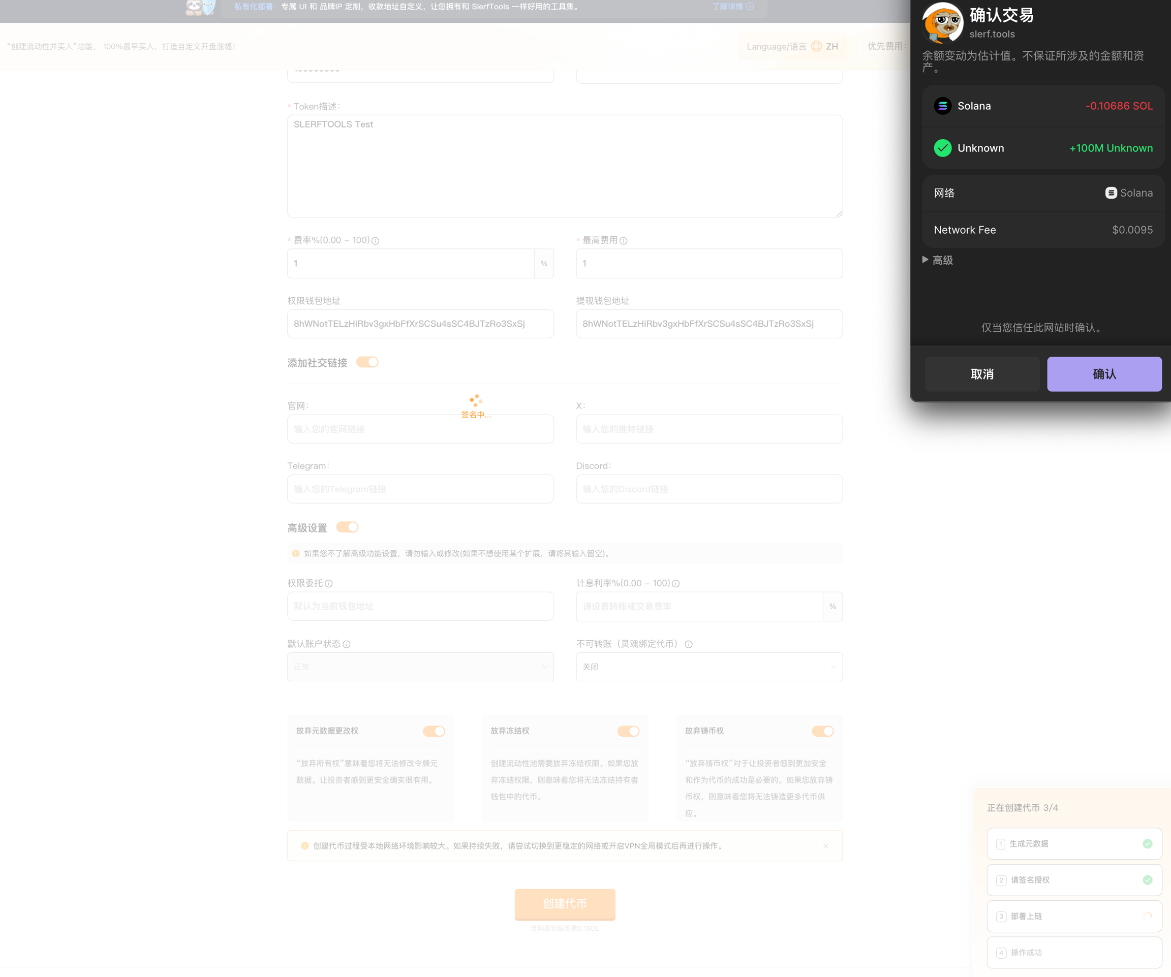 После нажатия на кнопку создания токена сначала будет создан файл метаданных (Metadata), процесс занимает примерно 10 секунд, затем откроется кошелек для подписи и создания токена в блокчейне.