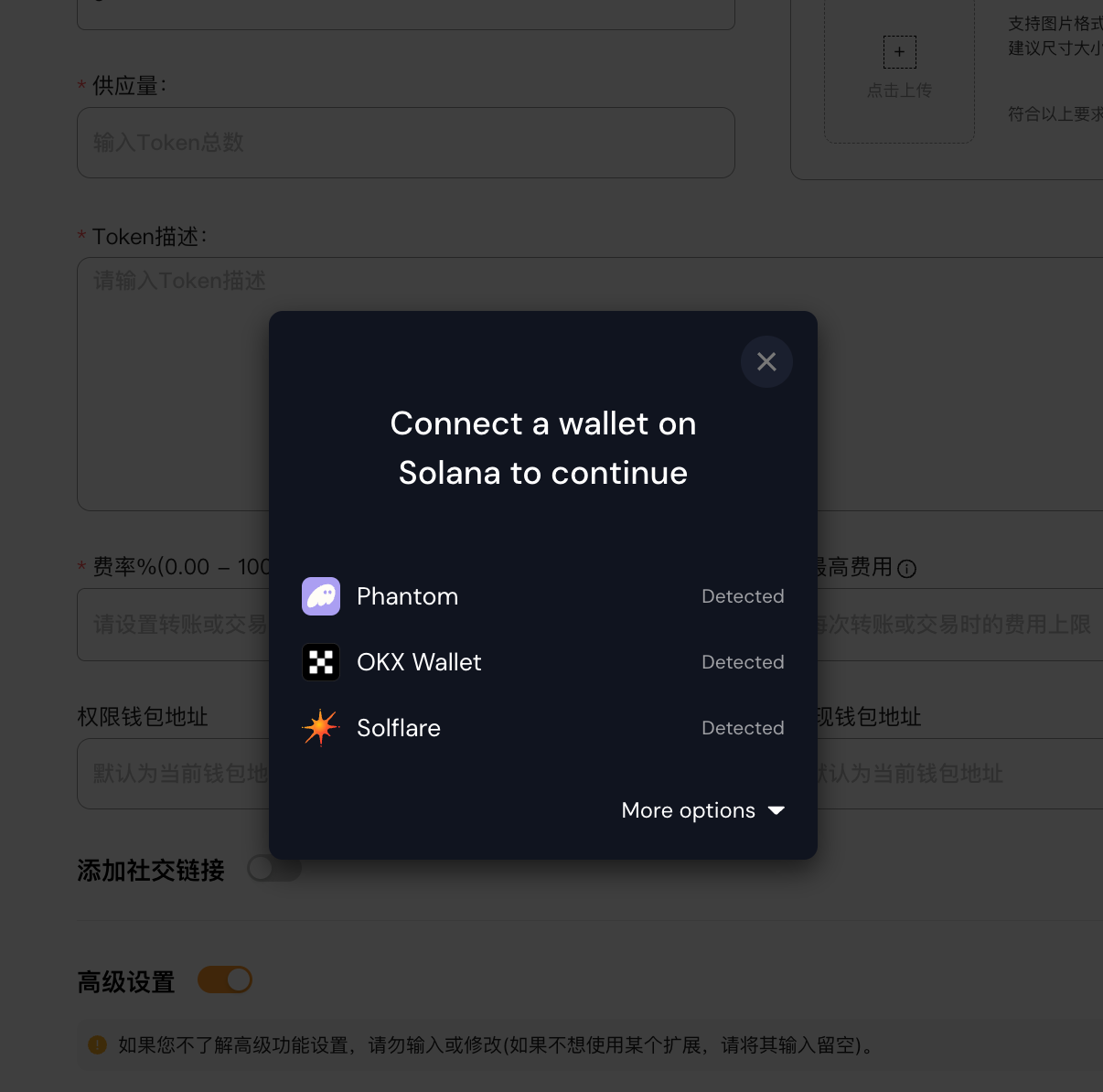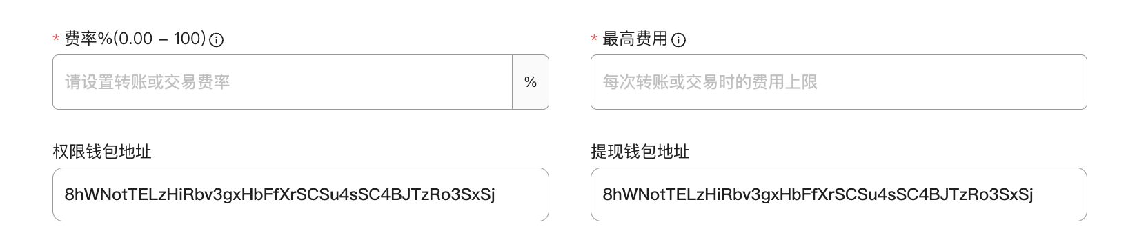 • Адрес для вывода комиссий: адрес, который имеет право на вывод комиссий, полученных за токены, по умолчанию текущий подключенный кошелек