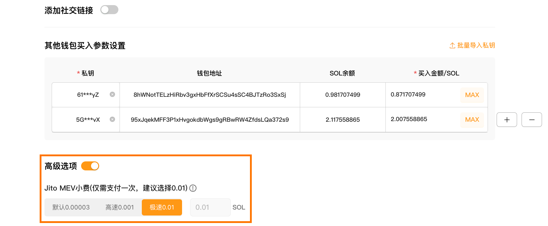 После импорта установите сумму SOL для каждого кошелька (баланс кошелька должен быть ≥ 0.1 SOL)