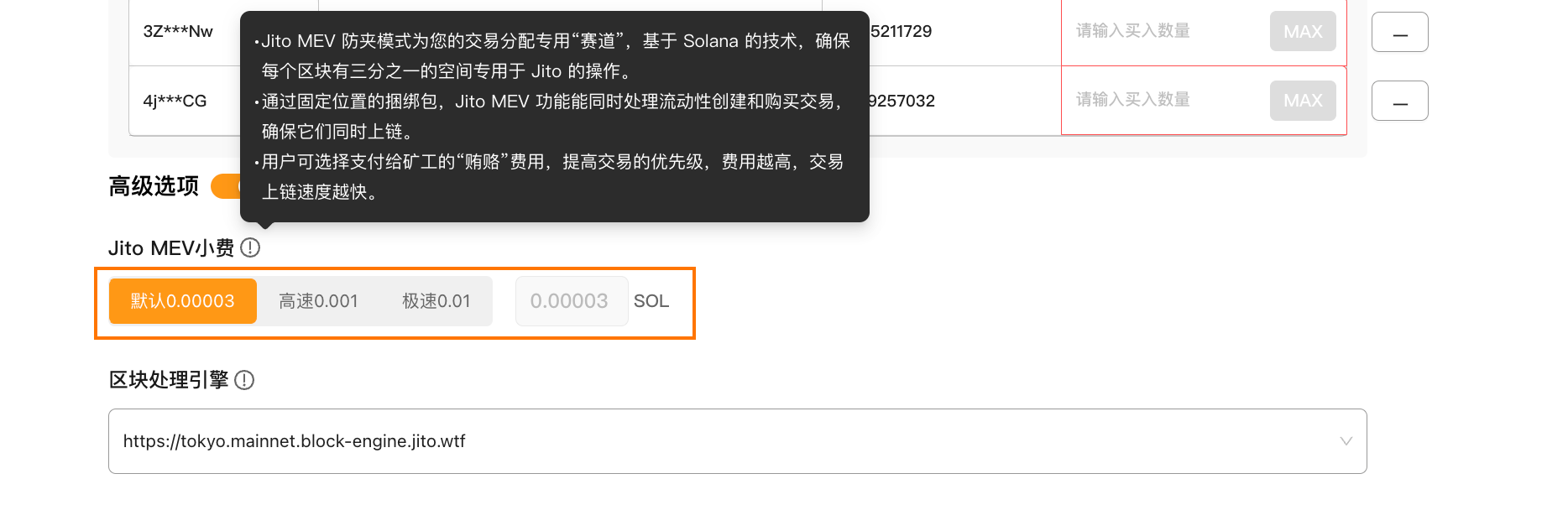 Эта функция реализована с помощью функции привязки Jito. Из-за сетевой среды, узлов Jito, RPC-узлов и сложности движка обработки блоков, функция может сталкиваться с высокой частотой неудач. Если операция не удалась, никаких затрат не будет, попробуйте изменить RPC-узел, движок обработки блоков, увеличить чаевые для Jito и повторить попытку в период низкой активности сети.