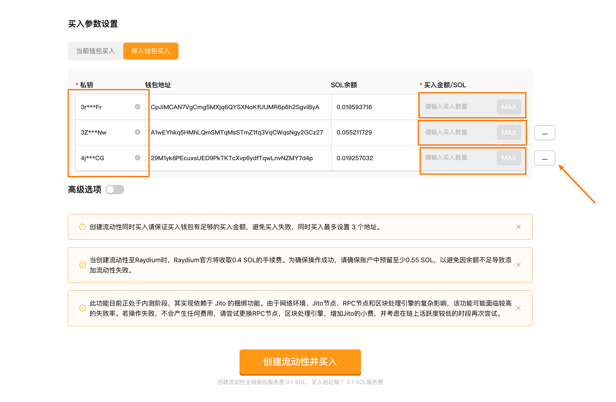 Для обеспечения 100% успеха привязанной покупки можно импортировать до 3 адресов. По умолчанию есть 3 поля для ввода адреса кошелька, если требуется только 1 или 2 адреса, удалите лишние поля.
