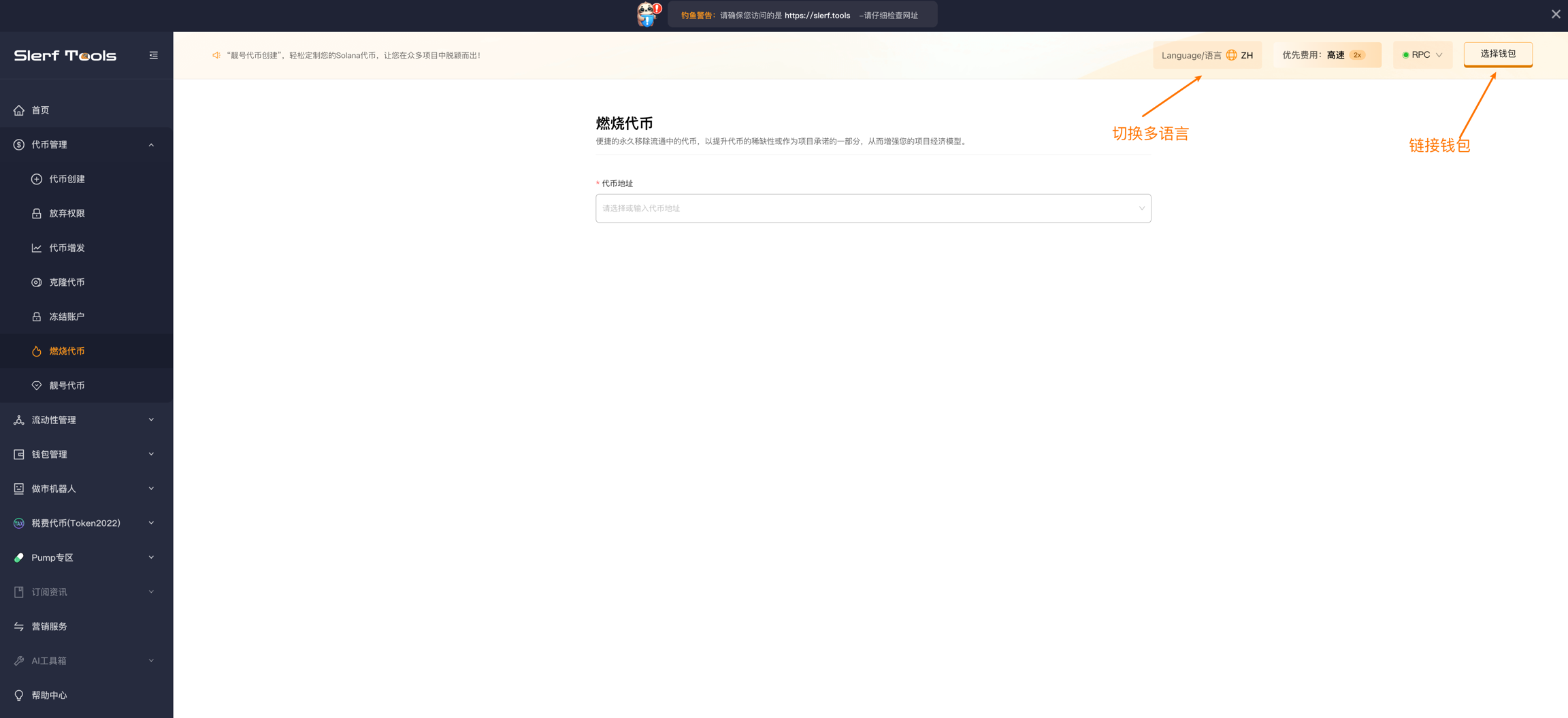 Перейдите на страницу сжигания токенов в SlerfTools. В правом верхнем углу доступна функция смены языка.
