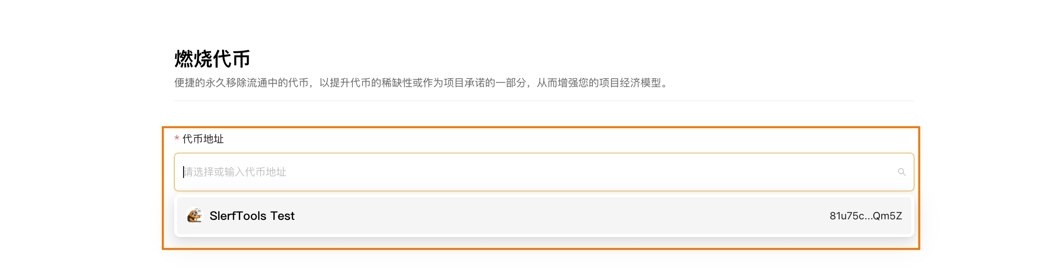 Выберите или введите адрес контракта токена, который хотите сжечь.