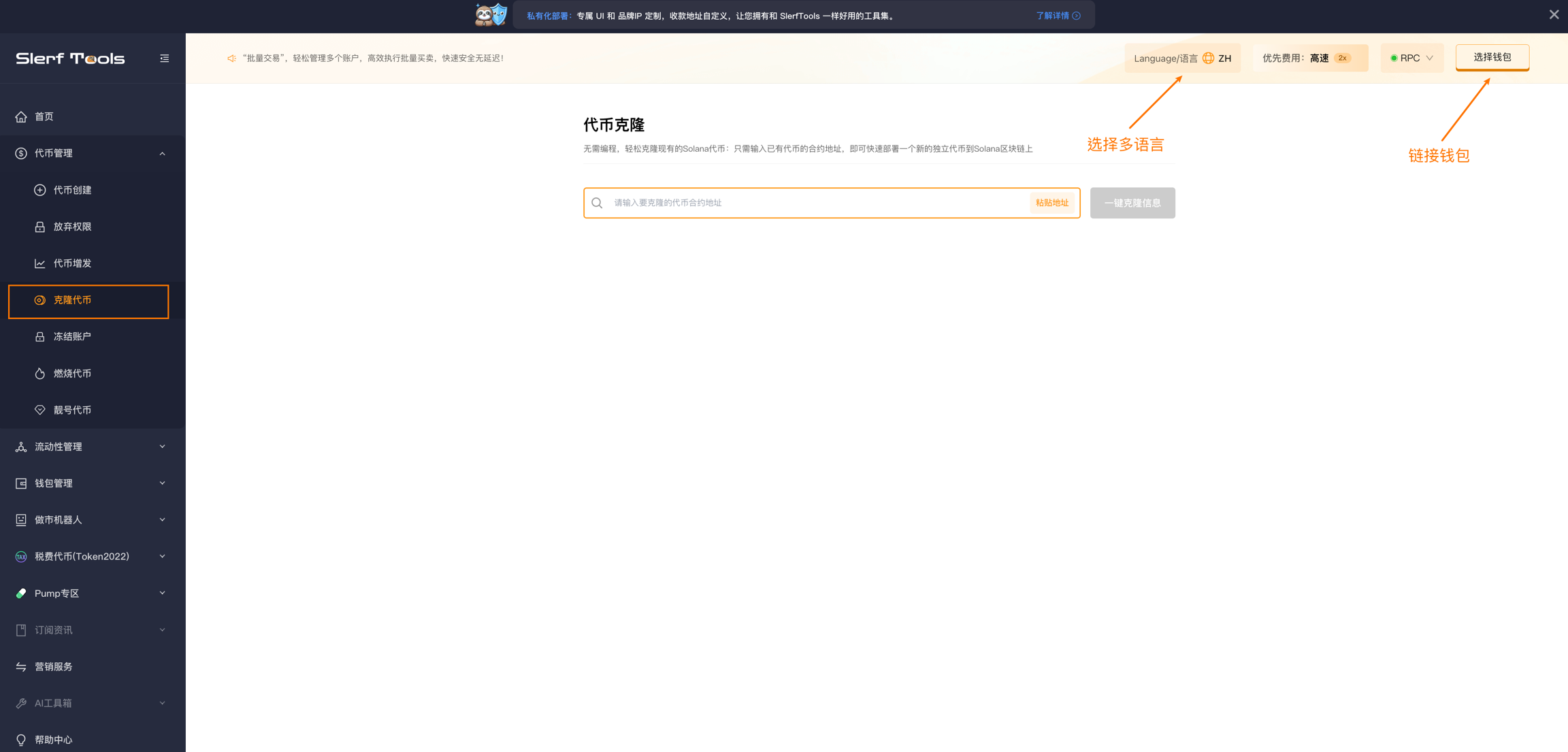 Перейдите на страницу клонирования токенов в SlerfTools. В правом верхнем углу доступна функция смены языка.