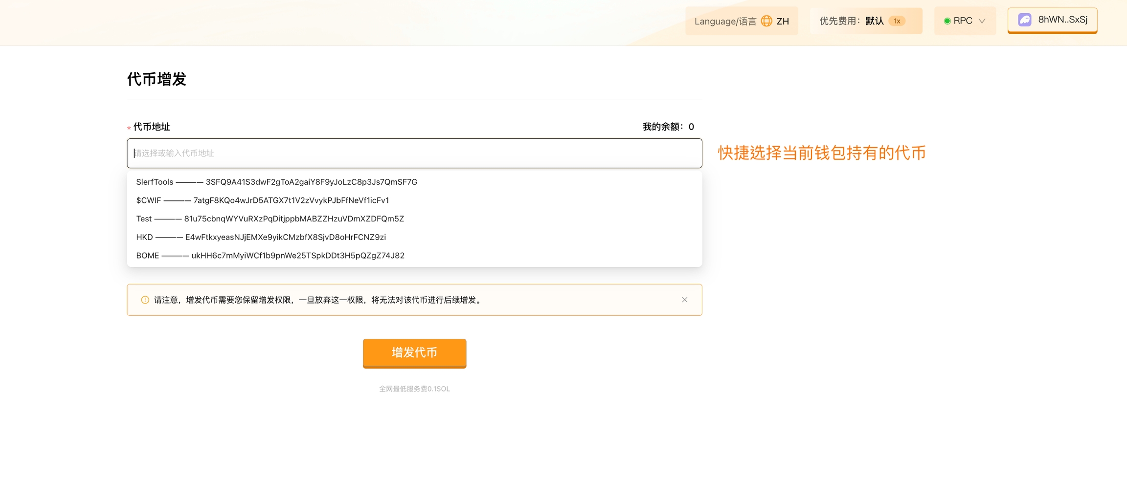 Перейдите на страницу дополнительной эмиссии токенов в SlerfTools. В правом верхнем углу доступна функция смены языка.