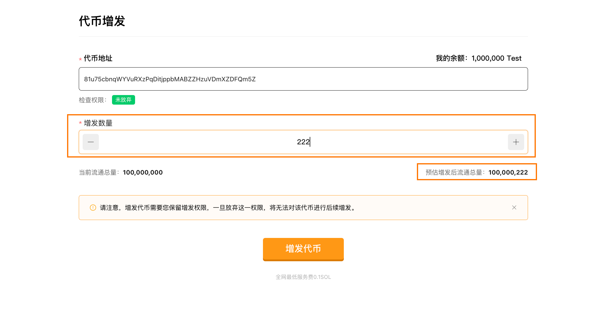 Проверьте права на дополнительную эмиссию токенов: • Если права на дополнительную эмиссию токенов уже были отменены или текущий подключенный кошелек не имеет таких прав, будет отображено сообщение “Отказано”, и эмиссия невозможна. • Если текущий подключенный кошелек имеет права на дополнительную эмиссию токенов, и права не были отменены, вы сможете выполнить эмиссию, как показано на изображении ниже.