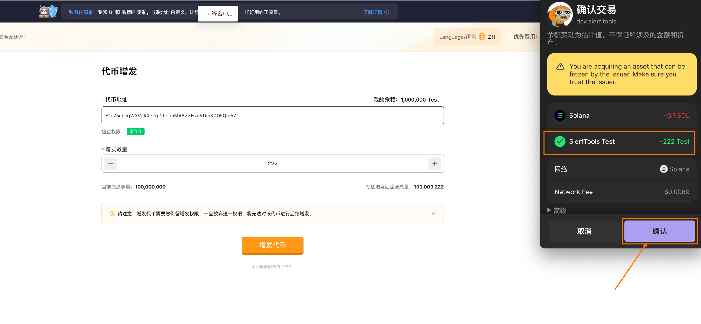Подтвердите эмиссию, подпишите транзакцию и дождитесь завершения процесса дополнительной эмиссии токенов.