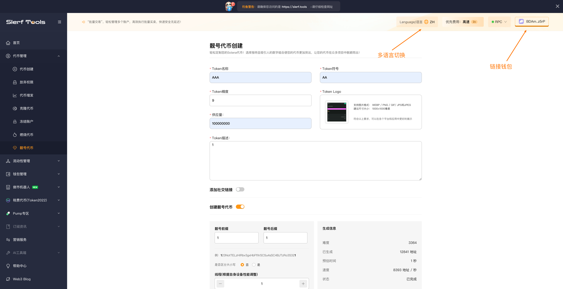 Перейдите на страницу создания уникального номера токена SlerfTools. В правом верхнем углу страницы доступна функция смены языка.