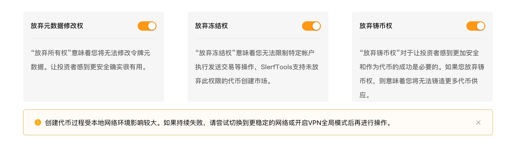 Право на изменение метаданных: Отказ от этого права означает, что вы не сможете изменять метаданные токена, такие как имя и логотип.